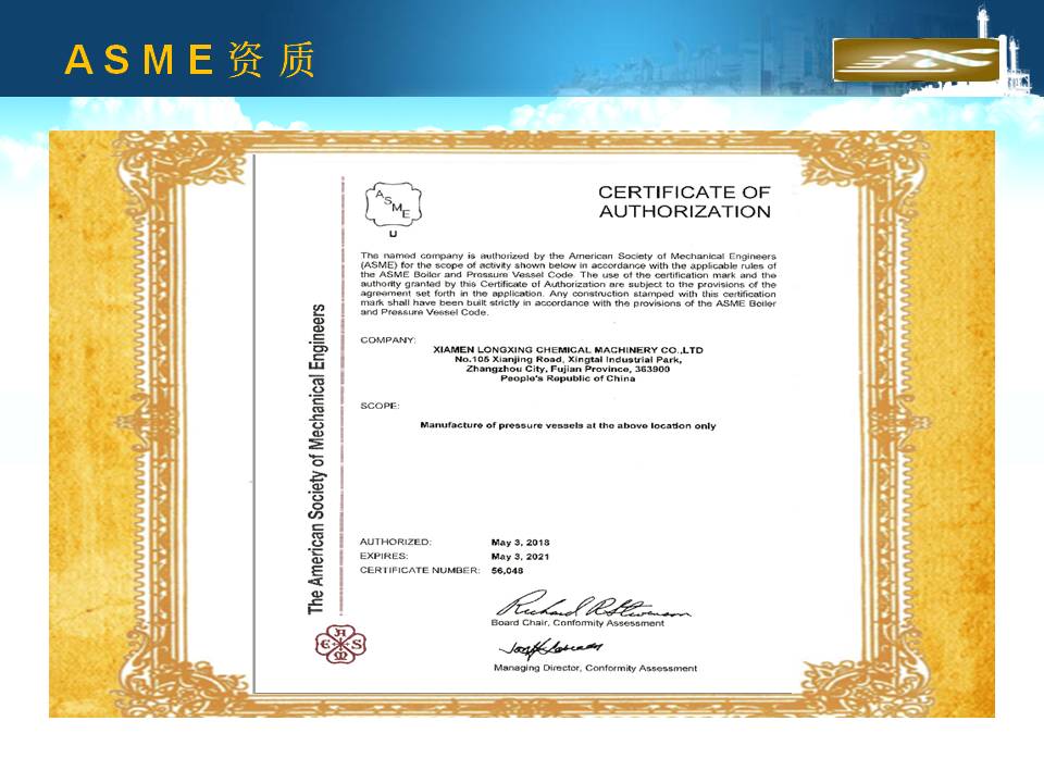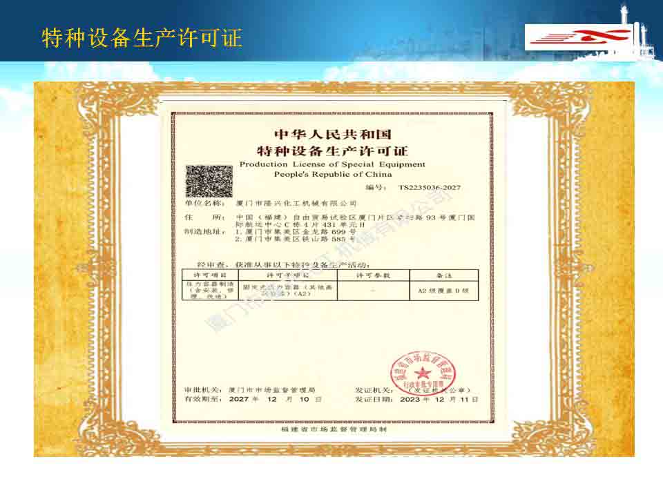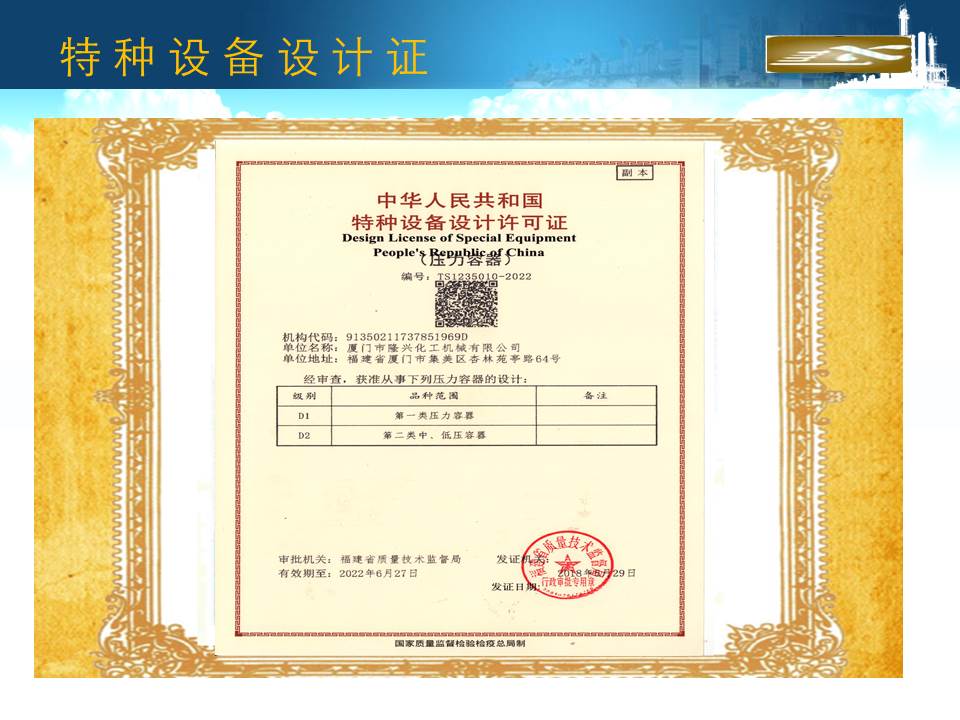 廈門隆興化工機(jī)械有限公司成立于2001年5月,占地面積30000平方米,擁有生產(chǎn)車間面積10000平方米及相關(guān)配套的辦公場所3000平方米,其中下料場所1000平方米,不銹鋼制作場所2000平方米,ASME產(chǎn)品制作區(qū)域1200平方米,無損曝光室30平方米。公司有職工135人,擁有專業(yè)的技術(shù)人員和管理人員36人。公司主要從事設(shè)計(jì)、制造A2級(jí)覆蓋D類壓力容器...