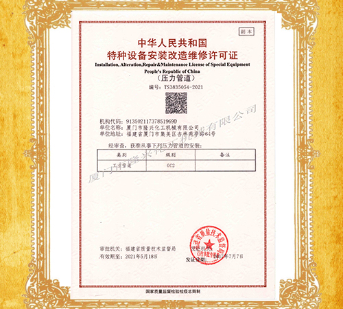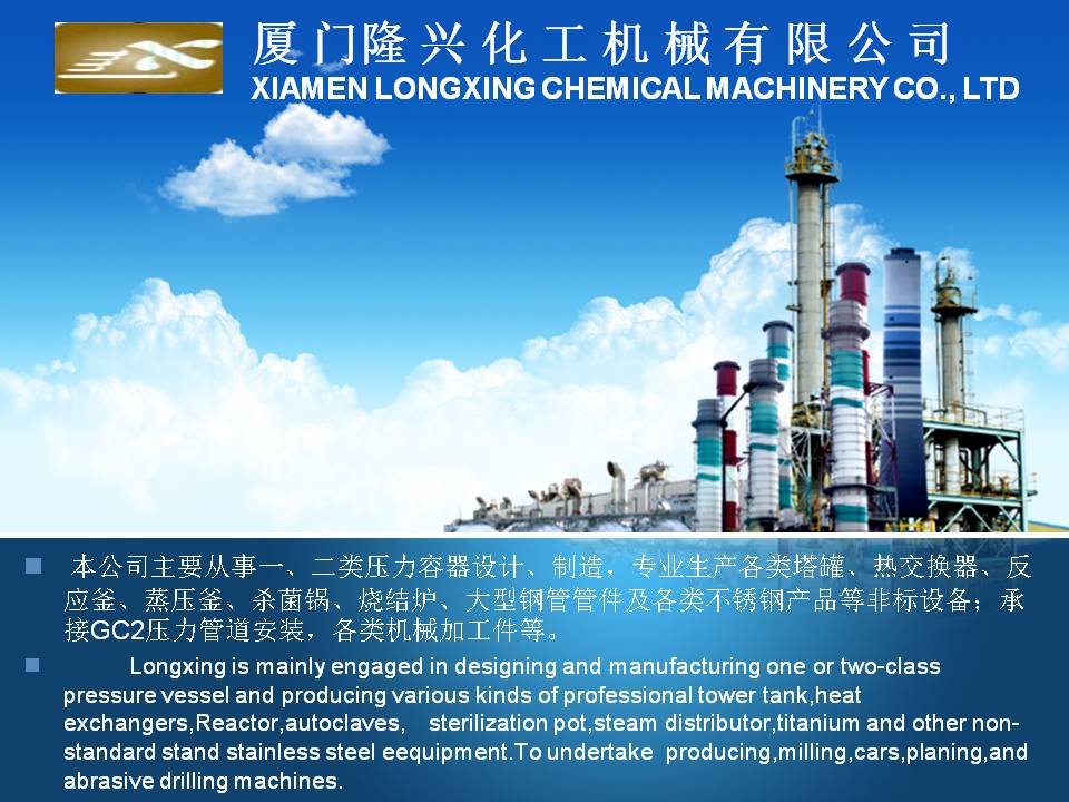 廈門隆興化工機(jī)械有限公司成立于2001年5月,占地面積30000平方米,擁有生產(chǎn)車間面積10000平方米及相關(guān)配套的辦公場所3000平方米,其中下料場所1000平方米,不銹鋼制作場所2000平方米,ASME產(chǎn)品制作區(qū)域1200平方米,無損曝光室30平方米。公司有職工135人,擁有專業(yè)的技術(shù)人員和管理人員36人。公司主要從事設(shè)計(jì)、制造A2級(jí)覆蓋D類壓力容器...
